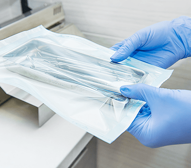 歯科医師やスタッフが身に付けるゴム手袋や、患者様が使うコップ、エプロンなどは、その都度廃棄しています。その他の医療器具は、特殊な装置による滅菌処理をして、感染リスク0を目指しています。